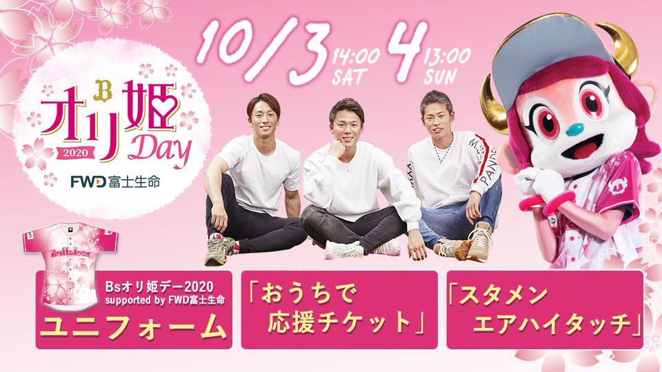 オリックス・バファローズでは、延期になっておりました「Bsオリ姫デー2020 supported by FWD富士生命」を、10月3日(土)、4日(日)の楽天戦にて開催することとなりましたので、お知らせいたします。