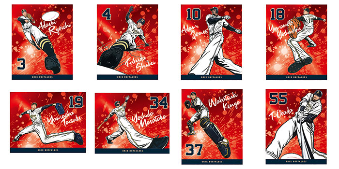 安達選手、福田選手、ジョーンズ選手、山本投手、山岡投手、吉田正選手、若月選手、T-岡田選手が劇画タッチイラストに!イラストレーター横山英史氏とのコラボグッズ登場!