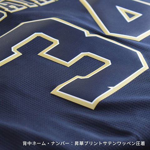 | カラー | ネイビー×ゴールド (胸ロゴ:刺繍/背中ネーム・ナンバー:昇華プリントサテンワッペン圧着) ※胸番号は入りません。 |