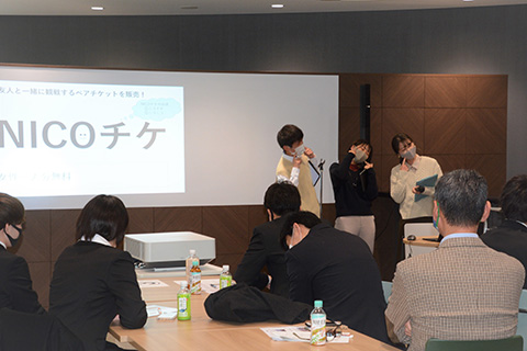 発表会では、学生ならではのユニークなアイデアが続々と登場。例えば、大阪商業大学は、野球観戦と音楽フェスの共通点を見出し「音楽フェスのように空間を楽しめる野球観戦イベント」として、応援グッズのレンタルサービスや芝生にテントを立てたリラックスゾーンの設置を提案しました。関西大学は、友人を誘いやすくするためのペアチケットを考案し、ニコイチとニコニコをかけて「NICOチケ」と命名。企画に合わせて考えた"決めポーズ"と共に披露し、会場を和ませました。