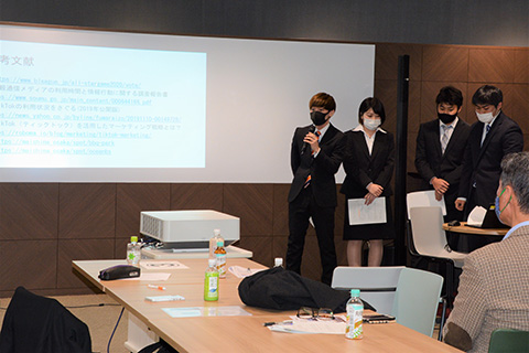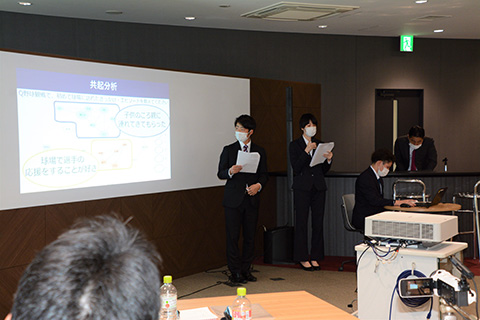 ファームの来場者調査をし、その分析結果を基に企画提案を行うこの発表会は、大学と自治体とバファローズが提携して実施し、今年で7回目。例年は各地方試合を研究対象としていましたが、今年は新型コロナウイルス感染症の影響で開催されなかったため、オセアンバファローズスタジアム舞洲を対象に調査を行いました。