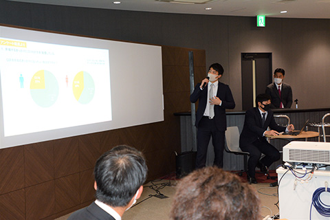 初参加だった大阪成蹊大学は、筋肉フェチの女性をターゲットにし、選手の筋肉に見て触れられる企画「Bs筋肉デー」を提案。アイデアを100個出し合い、最も面白かった案を"肉付け"したそうです。リーダーの大塚光陽さん(2回生)は「新規性のある楽しい案を出そうと頑張ったが、球団や他大学の先生からの指摘を聞いて、実現性が足りなかったこともわかり、とても勉強になった」と明るい笑顔で話していました。