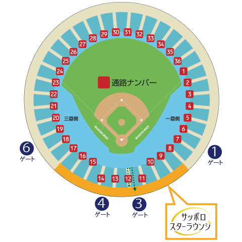 サッポロスターラウンジ(4F)へは、通路12(3F)よりスタンド内へ入り、右側のスタンド内階段をあがってください。