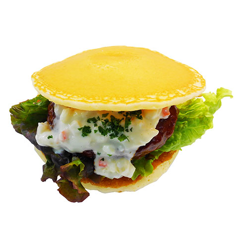 | 商品紹介 | 『椋くんのもぐもぐパンケーキバーガー』 椋くんオススメ!テリヤキハンバーグとタルタルソースをしっとり生地のパンケーキではさみました♪ |
