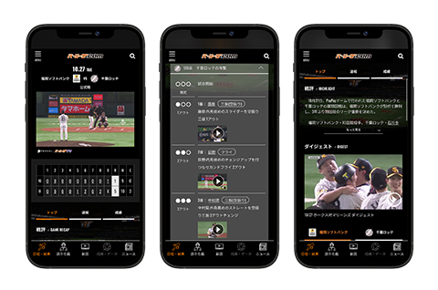 パ・リーグ公式戦のLIVE視聴※1に加えて、新たに、試合成績・速報・スタメン情報など試合関連データが、試合映像と同じ画面内でチェックできるようになりました。また見逃したシーンの「イニング毎見逃し視聴」に加え、試合経過や打席結果から「1打席毎のプレー動画機能」も新たに公開いたしました。