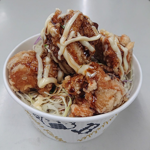 | 商品紹介 | 「唐揚げマウンテンめし」 にんにくを効かせたソースとマヨネーズが食欲をそそります。 ボリューム抜群、お腹もMax!! |