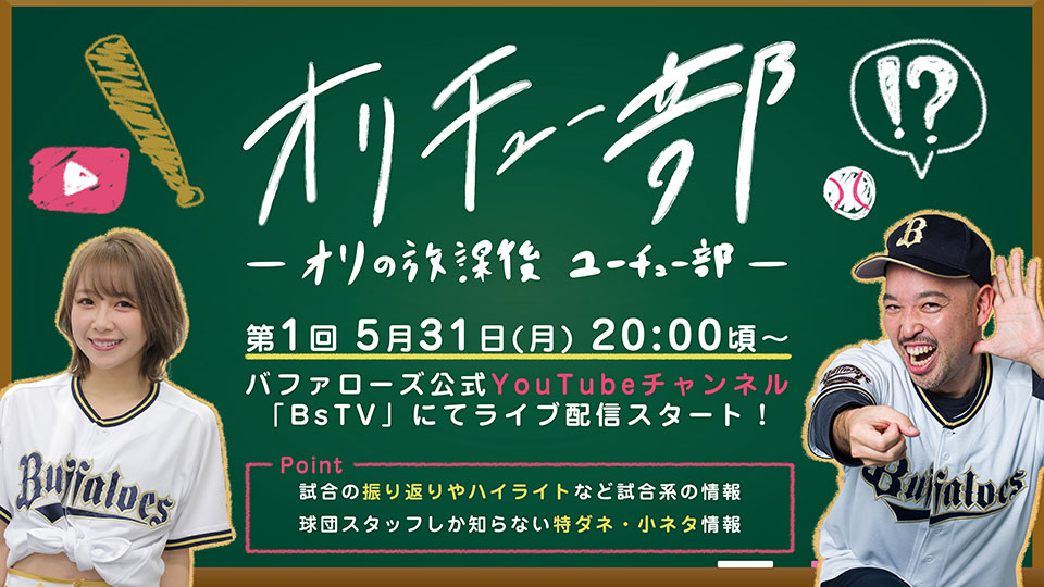 放課後の教室に仲間が集まっておしゃべりするように、ファンと一緒にわいわい楽しくおしゃべりしたい!オリックスファンみんなで盛り上げていくYouTube番組「オリの放課後 ユーチュー部」がスタート、BsTVにてライブ配信いたします!