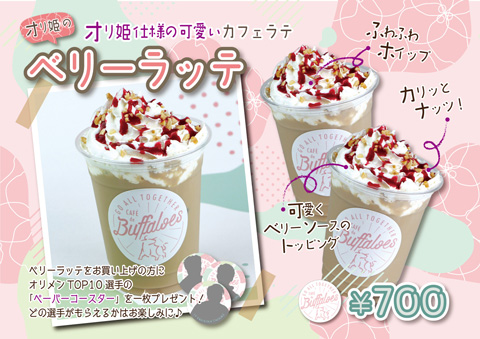 | 商品紹介 | 「オリ姫のベリーラッテ」 ふわふわホイップにカリッとナッツ♪ トッピングには可愛くベリーソース(^o^) オリ姫仕様のラテです。 |