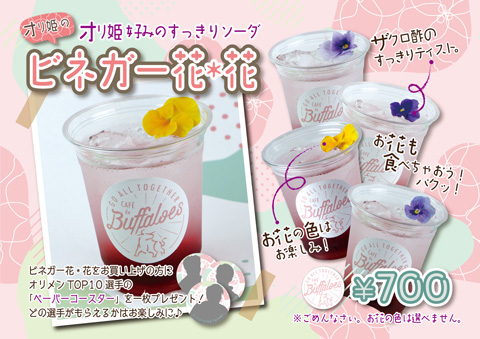 | 商品紹介 | 「オリ姫の『ビネガー花*花』」 お花も食べられる*ザクロ酢を使ったすっきりテイストのソーダ! ※花の色は選べません。 |