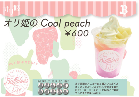 | 商品紹介 | オリ姫のCool peach かき氷ベースにソフトクリームやピーチをトッピング♪ 暑い日にスッキリな一品です。 |