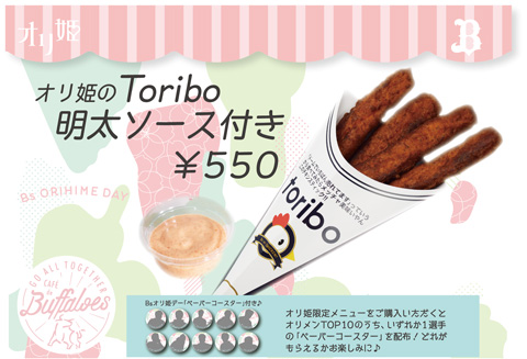 | 商品紹介 | toribo 明太ソース付き 定番のトリボー、オリ姫限定で明太ソース付きが登場! この機会にご賞味ください。 |