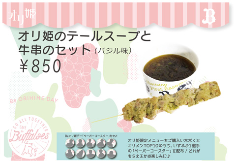 | 商品紹介 | オリ姫のテールスープと牛串のセット(バジル味) 名物のテールスープにイベント限定の牛串バジル味の満足出来るセット!この機会に是非ご賞味ください。 |