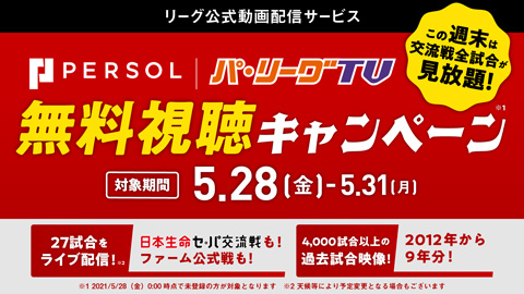 リーグ公式動画配信サービス「パーソル パ・リーグTV」では、2021年5月28日(金)から5月31日(月)の期間において、無料視聴キャンペーンを実施いたします。期間中は、試合のライブ配信やイニング動画(見逃し視聴)、注目シーンのカメラアングルを選んで視聴できるマルチアングルビデオなど、全ての有料サービスが無料でご利用可能!