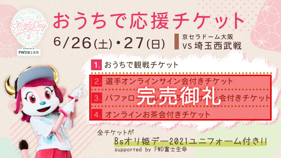 ご好評につき即日完売御礼となりました「Bsオリ姫デー2021 supported by FWD富士生命 おうちで観戦チケット」を、オリ姫・オリ達の皆様からの熱いご要望にお応えして、各日50枚限定で6月2日(水)17:00より追加販売いたします!