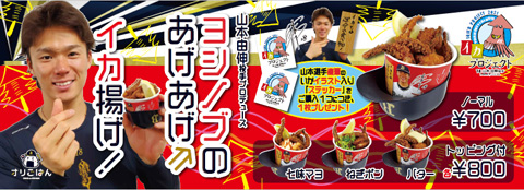 | 商品紹介 | 『ヨシノブのあげあげ↑↑イカ揚げ!!」』 イカプロジェクト第二弾は、山本投手が大好きなイカの唐揚げです! トッピングはねぎポン、七味マヨ、バターの3種類をご用意。お好みに合わせてお選びいただき、気分アゲアゲでお召し上がりください♪ お買い上げいただいた方には山本投手作画のイラスト入りオリジナルステッカーをプレゼント! |