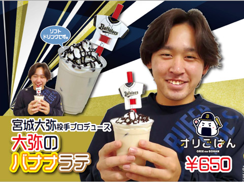 | 商品紹介 | 『大弥のバナナラテ』 バナナがふんわり香るカフェラテに、ふわふわのホイップクリームとチョコレートソースをトッピング。デザート感覚で味わって♪ |