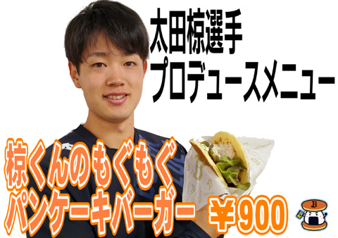 | 商品紹介 | 『椋くんのもぐもぐパンケーキバーガー』 テリヤキハンバーグとタルタルソースを、しっとり生地のパンケーキでサンドしました。太田選手おすすめの食べ応え十分な一品です♪ |