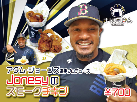 | 商品紹介 | 『Jonesyのスモークチキン』 スモーキーな風味の骨付きチキンとオニオンリングがセットに!おやつや、おつまみにピッタリです♪ジョーンズ選手オリジナルカップに入れてご提供いたします! |