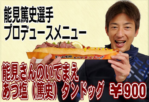| 商品紹介 | 『能見さんのいてまえあつ塩(篤史)タンドッグ』 スモークした豚タンを、能見投手兼任コーチこだわりのゴマ油と塩だれでアレンジしてはさみました。ソーセージも加わりボリューム満点! |