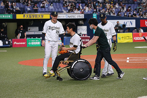 パラアーチェリーを始めて10年近く「バファローズの始球式に呼ばれるぐらいの活躍を」と思い続けて叶った念願の始球式。登板前にはスタンド席に向かって「京セラドームで投げるという夢が叶いました。東京パラリンピックでの金メダルというもう一つの夢を叶えるためにしっかりと頑張りますので、応援よろしくお願いいたします」と挨拶されました。打席には上山さんが大好きな宗佑磨選手、捕手は紅林弘太郎選手。マウンド上、車いすから振りかぶった堂々の投球に万雷の拍手が送られました。