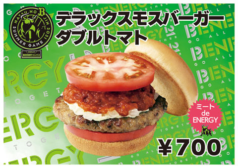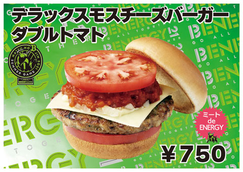 | 商品紹介 | (1)「デラックスモスバーガー ダブルトマト」 (2)「デラックスモスチーズバーガー ダブルトマト」 国産肉(牛・豚の合挽き肉)100%使用のふっくらとしたボリュームのあるハンバーグに、たっぷりのオニオン、自慢のミートソースをのせ、輪切りのトマトを2枚でサンドしました。名前の通り“デラックス”なモスバーガーです! |