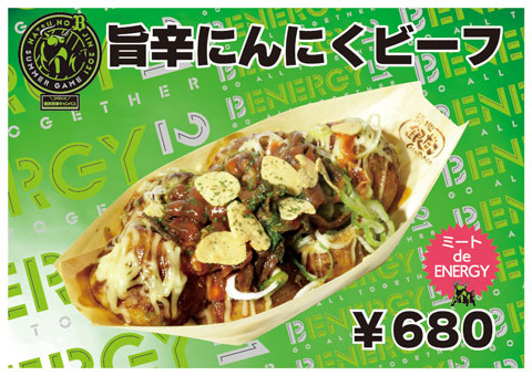 | 商品紹介 | 「旨辛にんにくビーフ」 夏の陣限定!和風醤油ダレのたこ焼に、旨辛シラチャ―ソースを絡めた牛肉をトッピングしました。最後にフライドガーリックをちらして完成です! |
