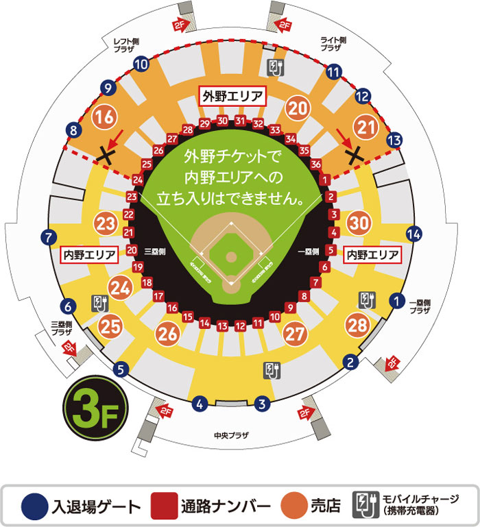 内野チケットのお客様は外野3Fコンコースまでは立ち入り可能ですが、スタンド内への立ち入り及び外野4Fコンコースへの通行はできません。
