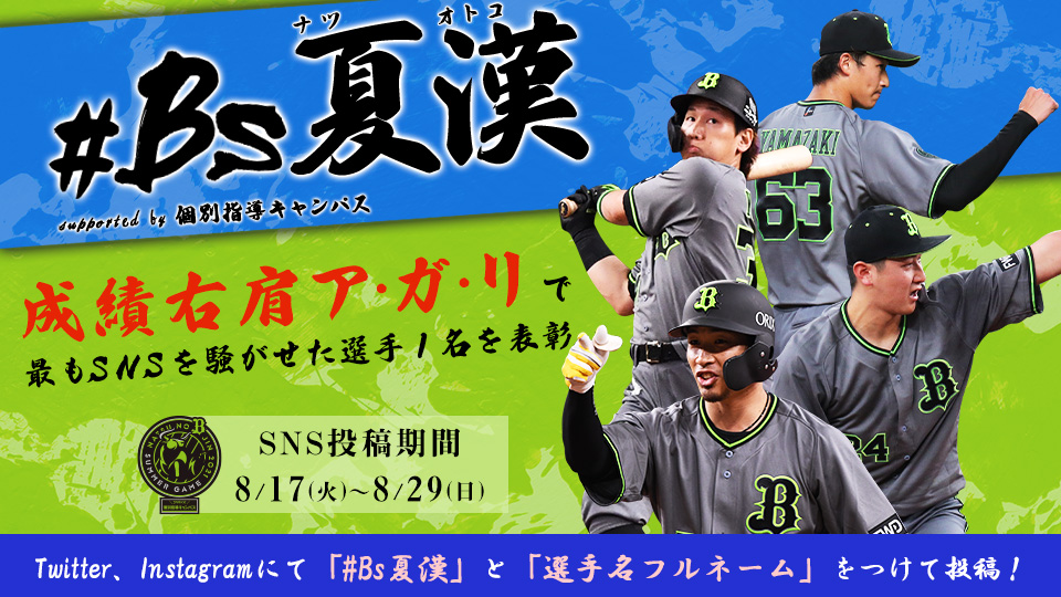 オリックス・バファローズでは、8月のBs夏の陣期間中に”成績右肩ア・ガ・リ⤴”で最もSNSを騒がせた選手1名を表彰する「Bs夏漢(ナツオトコ) supported by 個別指導キャンパス」を開催することが決定しました!Bs夏漢を決めるのは、もちろんファンの皆さんです!Bs夏の陣期間中の試合を観戦して、夏漢にピッタリだと思う選手のフルネームをハッシュタグ「#Bs夏漢」をつけてどんどんSNS投稿してください。初代Bs夏漢に輝くのはどの選手か?!皆さんの投稿をお待ちしております!