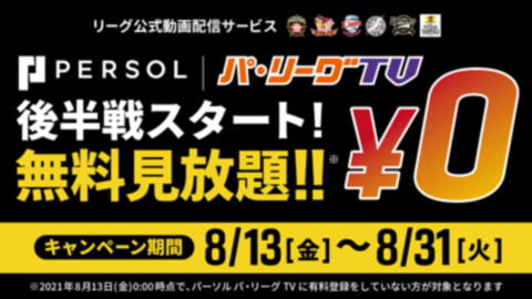リーグ公式動画配信サービス「パーソル パ・リーグTV」では、2021年8月13日(金)から8月31日(火)の期間において、無料見放題キャンペーンを実施いたします。期間中は、試合のライブ配信やイニング動画(見逃し視聴)、注目シーンのカメラアングルを選んで視聴できるマルチアングルビデオなど、全ての有料サービスが無料でご利用可能!
