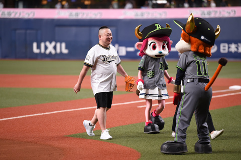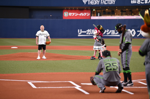 始球式は、バッターボックスに宗佑磨選手、キャッチャーに西村凌選手が入りました。浅井さんは思い切り良く振りかぶって投球。両軍ベンチと客席からは大きな拍手が送られました。