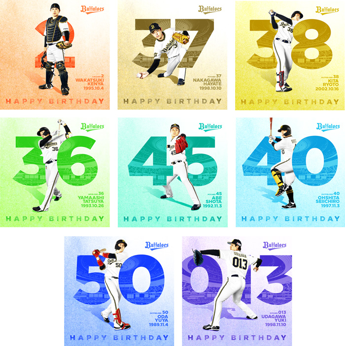 10月・11月前半生まれ8選手のグッズをオンラインショップ限定で受注販売いたします。球団公式SNSで選手の誕生日にアップされるクールな選手バースデーグラフィックがデザイン! 9月3日(金)から6日(月)までの期間限定、お見逃しなく!