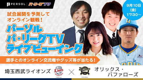 パシフィックリーグマーケティング株式会社(本社:東京都中央区、代表取締役CEO:根岸 友喜)は、2021年度パシフィック・リーグのオフィシャルスポンサーである、総合人材サービスのパーソルホールディングス株式会社(本社:東京都港区、代表取締役社長 CEO:和田 孝雄)とともに、コロナ禍における新しい野球観戦体験の提供を目指し、「試合展開を予測して、オンライン観戦!パーソル パ・リーグTVライブビューイング」をパーソル パ・リーグTV公式YouTubeチャンネルにて、2021年9月10日(金)17:30より生配信を実施する事をお知らせいたします。