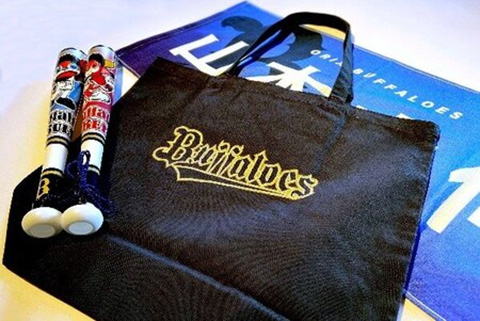 ・ガッチリお土産!バファローズ応援グッズ(Buffaloes応援タオル、Buffaloesマスコットツインバット、Buffaloesネーム&ナンバートートバッグ)1名様につき1セット