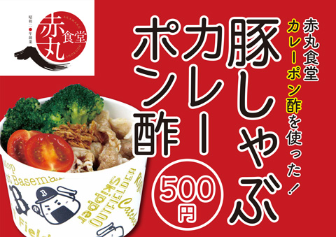 | 商品紹介 | 「赤丸食堂 カレーポン酢を使った!豚しゃぶカレーポン酢」 豚しゃぶにポン酢の酸味とカレーのスパイスが融合した一品! たっぷりつけて召し上がれ♪ |