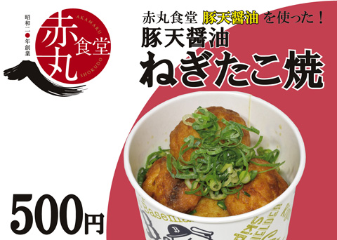 | 商品紹介 | 「赤丸食堂 豚天醤油を使った!豚天醤油ねぎたこ焼」 ねぎたっぷりのたこ焼に豚天醤油をサッとかけた、さっぱり食べられるたこ焼です♪ |