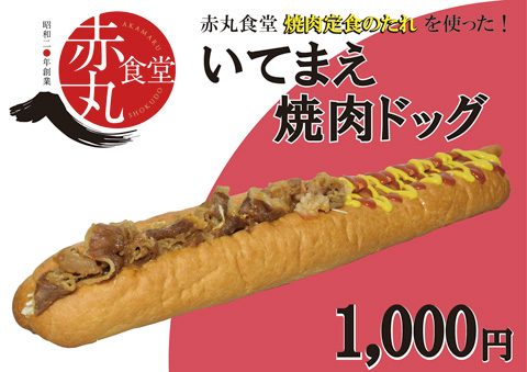 | 商品紹介 | 「赤丸食堂 焼肉のたれを使った!いてまえ焼肉ドッグ」 焼肉定食のたれで味付けをした牛肉をトッピング! 赤丸食堂コラボいてまえドッグです♪ |