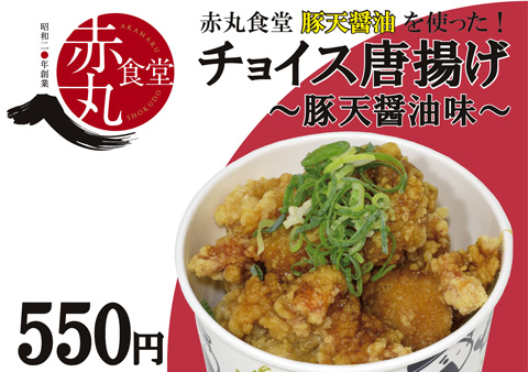 | 商品紹介 | 「赤丸食堂 豚天醤油を使った! チョイス唐揚げ~豚天醤油~」 豚天醤油と唐揚げの相性はバッチリ!お店にお立ち寄りの際はぜひお試しください。 |