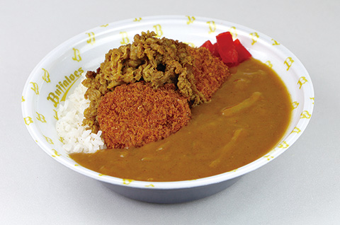 | 商品紹介 | 「バファローズ勝つカレー」 牛肉をふんだんに使用し、牛骨スープで炊いた、バファローズらしい牛にこだわったカレーにカツ(勝つ)をトッピングした特別メニュー |