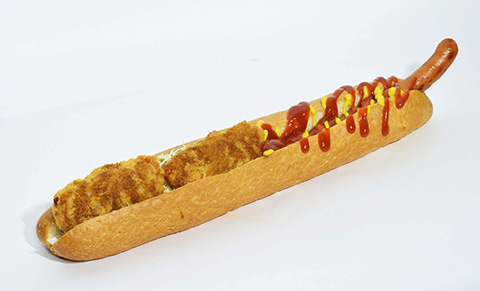 | 商品紹介 | 「いてまえV勝つドッグ」 大阪のソウルフード串カツをいてまえドッグにトッピングしました。カツ(勝つ)を食べて勝利間違いなし! |
