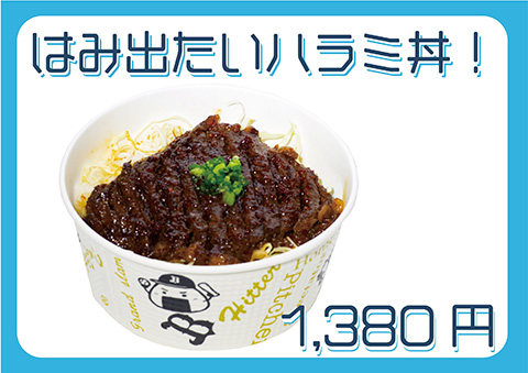 | 商品紹介 | 「はみ出たいハラミ丼!」 食べ応え抜群のハラミ肉をド~ンと1枚使った限定丼です! 自慢のヤンニョンダレが食欲をそそります♪ |