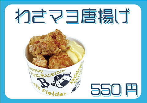| 商品紹介 | 「わさマヨ唐揚げ」 わさび味の唐揚げに、わさびマヨネーズ♪ わさびが効いた刺激的な唐揚げです! |