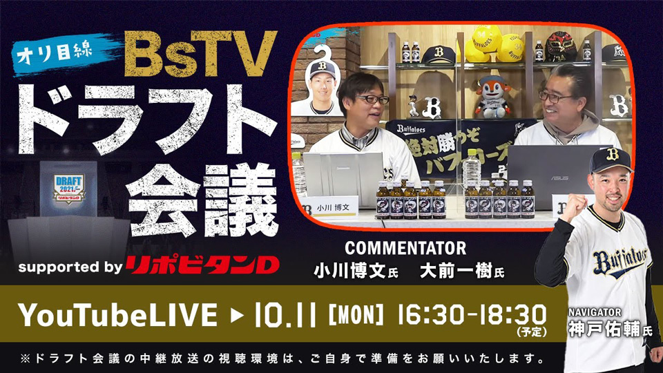 昨年に引き続き、球団公式YouTubeチャンネル「BsTV」にて16時30分頃よりライブ配信が決定!今年も大前一樹氏、球団OB小川博文氏、ボイス・ナビゲーター神戸佑輔氏をお迎えし、2021年ドラフトの予想・解説をしていただきます!
