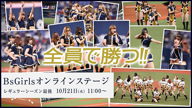 10月21日(木)レギュラーシーズンホーム最終戦にてBsGirlsオンラインステージを行います。画面を通じてBsGirlsのダイナミックなパフォーマンスをリアルタイムでご視聴いただき、バファローズへの想いを込めた楽曲とともに試合に向けて心をひとつにしましょう!球団公式YouTubeチャンネル「BsTV」で配信します。見逃さないよう、事前にチャンネル登録をオススメいたします!