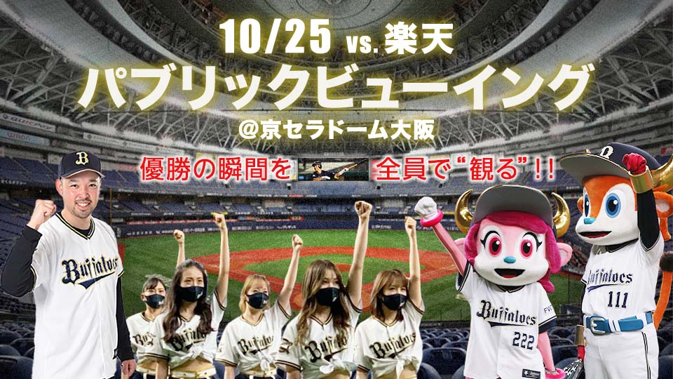 オリックス・バファローズ25年ぶりのリーグ優勝の瞬間をファンの皆さんと分かち合うべく、今シーズン最終戦となる10月25日(月)楽天VSオリックス戦にて、バファローズがパ・リーグ優勝決定の可能性がある場合、京セラドーム大阪の大型ビジョンでパブリックビューイングを開催します!ぜひ、皆さん京セラドーム大阪に集結し、バファローズの選手に思いを届け、リーグ優勝の瞬間を全員で見届けましょう!