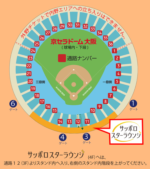 ・エクセレント指定席、ネット裏特別指定席、ビュー指定席以外の場内 内野席チケットのお客様は上図のとおり3階(下段)コンコースより通路12へ入った右側のスタンド内階段よりお越しください。