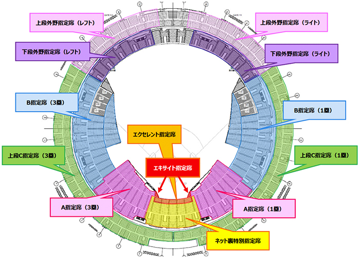 ※ステージ裏側や側面の座席(外野席および一部内野席)はステージイベント時に選手の表情が見えにくいお席になります。