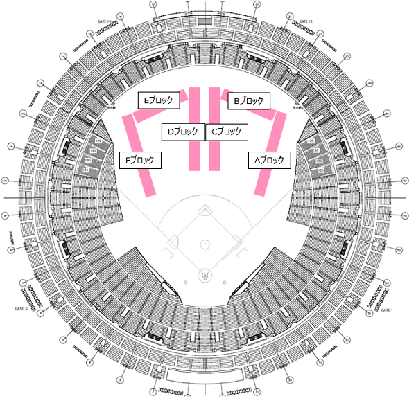 ・新型コロナウイルス感染症予防対策のため、下記図面のようにグラウンド観覧はブロックを分け、指定席を設けてご案内いたします。お席は選べません。また、グラウンド観覧席番は当選メールに記載してお知らせいたします。