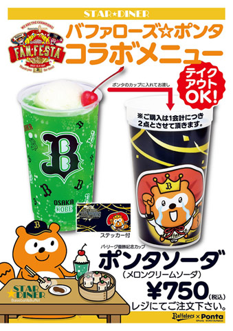 スターダイナーでは、ファンフェスタ限定で「バファローズ☆ポンタ パ・リーグ優勝記念ドリンクカップ入り「ポンタソーダ」を販売いたします。