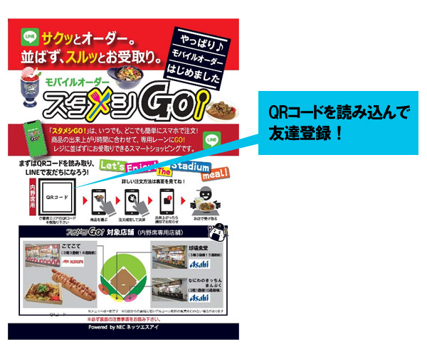 ※当日はご注文の都度QRコードを読んでいただく必要はありません。別の日にご利用の場合は、ご利用当日にスタジアム内でQRコードを改めて読み込み、自動的に表示されるテキストを送信してからご注文を始めてください。