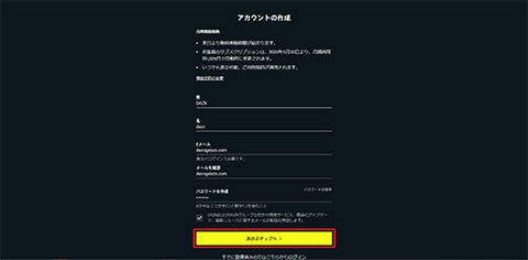 3.ご登録情報を入力し、「次のステップへ」をクリック